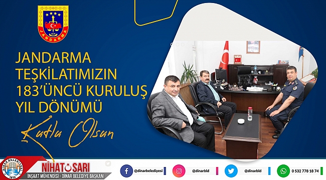 Jandarma Teşkilatımızın 183. Kuruluş yıldönümü kutlu olsun Dinar Belediye Başkanımız Nihat Sarı, Jandarma Teşkilatı'nın 183'üncü kuruluş yıldönümü nedeniyle