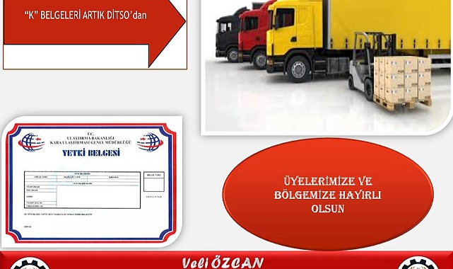 “K” BELGELERİ ARTIK DİTSO’danYönetim Kurulu Başkanımız Veli ÖZCAN’ın yoğun ısrarı ve takibi üzerine K Belgelerinin odamızdan verilmesi talebimiz gerçekleşmiştir. Önümüzde ki günlerde işlem yetkimizi almamız ile “K Türü Yetki Belgelerinin” verilmesine başlanacaktır. K Belgelerinin odamız tarafından verilmesi için bizlere destek olan Ulaştırma Bakanlığımıza; Yetki verilmesi için gece gündüz çalışarak Bakanlık görüşmelerini tamamlayıp Odamıza onay veren; Türkiye Odalar ve Borsalar Birliği (TOBB) Başkanımız Sayın M. Rifat HİSARCIKLIOĞLU’na, ve ayrıca sürecin başlatılmasına sebep olan ve desteğini esirgemeyen Afyonkarahisar Milletvekilimiz Mehmet TAYTAK’a teşekkür ederiz.Başvuru için: 02723536064 arayabilirler