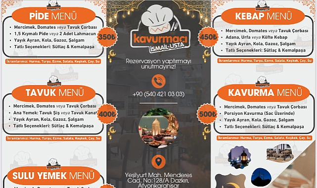 Afyonkarahisar’ın Dazkırı ilçesinde hizmet veren Kavurmacı İsmail Usta, Ramazan ayına özel iftar menüleriyle lezzet severleri bekliyor! Farklı damak tatlarına hitap eden Pide, Tavuk, Kebap, Sulu Yemek ve Kavurma menüleriyle sofralarınıza eşsiz tatlar sunuluyor.Menülerde mercimek, domates veya tavuk çorbası ile başlayan lezzet yolculuğu, özenle hazırlanan ana yemek seçenekleriyle devam ediyor. Yayık ayran, kola, gazoz ve şalgam içecekleriyle tamamlanan iftar menüleri, tatlı olarak sütlaç veya kemalpaşa sunumuyla taçlandırılıyor.İkramlar arasında ise hurma, turşu, ezme, salata, keşkeş, çay ve su yer alıyor. Fiyatlar 350 TL’den başlayarak 500 TL’ye kadar değişiyor.Lezzet dolu bir iftar için rezervasyon yaptırmayı unutmayın!Adres: Yeşilyurt Mah. Menderes Cad. No:128/A, Dazkırı, AfyonkarahisarRezervasyon: +90 (540) 421 03 03Dinar Gündem Gazetesi
