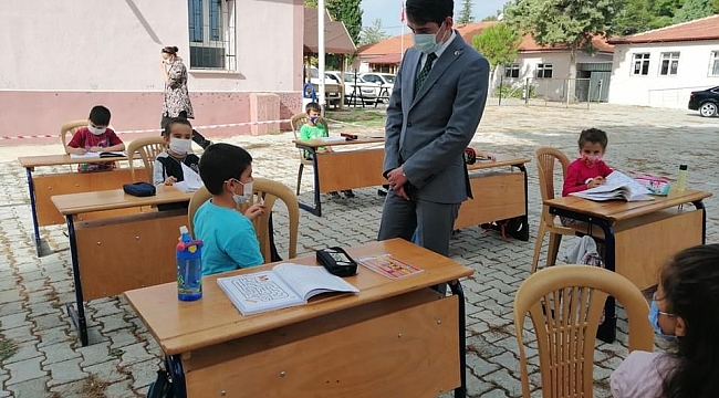 Okulun bahçesine sosyal mesafe, maske ve hijyen kurallarına uygun oluşturulan açık hava dersliğinde birinci sınıflar eğitim alıyor. Derslik ziyaretinde Kaymakamımıza İlçe Milli Eğitim Müdür Vekili Seyhan Avcı eşlik etti.
