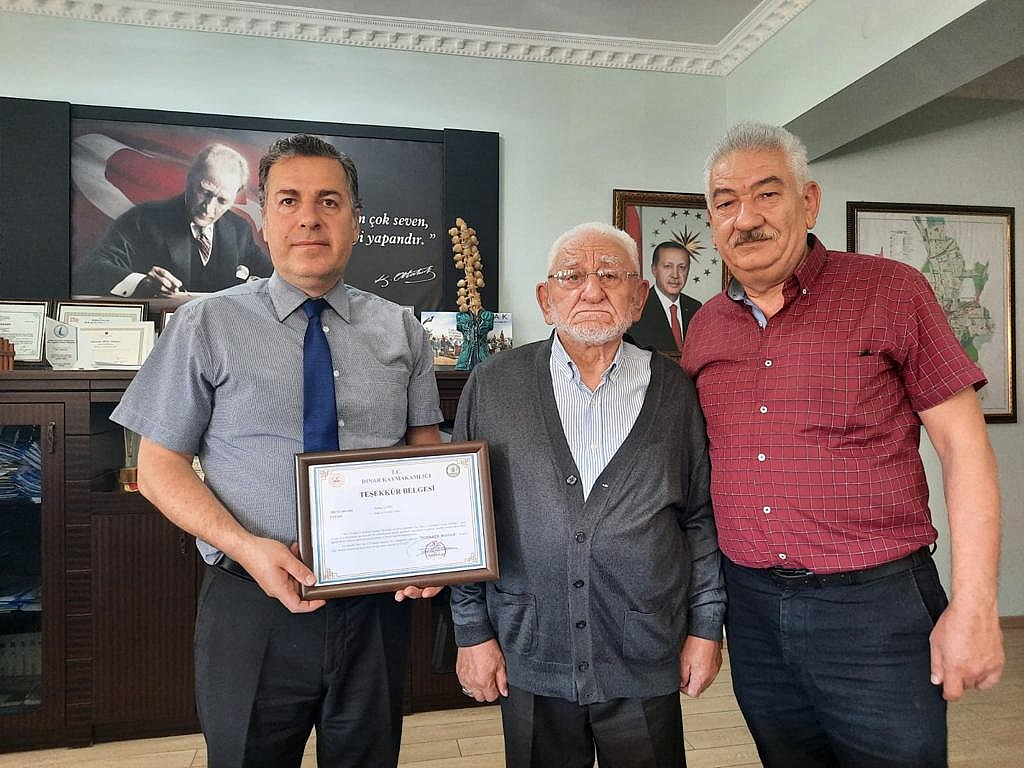 Görüşmede bir süre kendisiyle sohbet eden Kaymakamımız, Burhan Şahin’in örnek davranışı, hizmetleri, özverili çalışmaları ve iyi niyetlerinden dolayı kendisine Teşekkür Belgesi takdim ederek teşekkürlerini iletti.