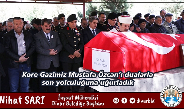 Dinar Belediye Başkanımız Nihat Sarı, protokol üyeleri, Şehit ve Gazi dernek temsilcileri, askerî erkan ve vatandaşların katılımıyla İncesu köyü camisinde alınan helalliğin ardından köy mezarlığında düzenlenen cenaze namazıyla birlikte Kore Gazimiz Mustafa Özcan son yolculuğuna uğurlandı.