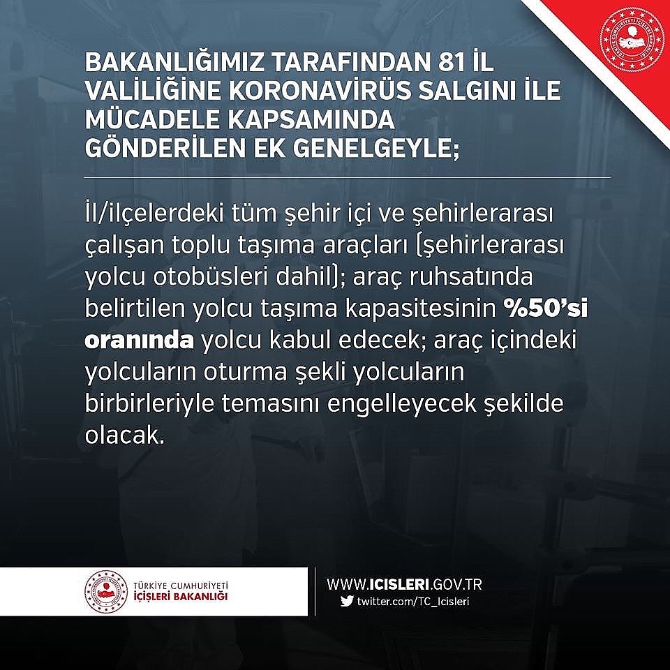 Bakanlığımız, 81 İl Valiliğine Koronavirüs (Kovıd-19) salgını ile mücadele kapsamında ek bir genelge daha gönderdi. Genelgeyle marketlerin çalışma saati ve marketlerde alışveriş yapan müşteri sayısı düzenlendi. Ayrıca tüm şehir içi ve şehirlerarası çalışan toplu taşıma araçları, geçici bir süreliğine araç ruhsatında belirtilen yolcu taşıma kapasitesinin %50’si oranında yolcu kabul edecek.