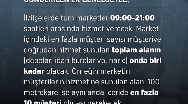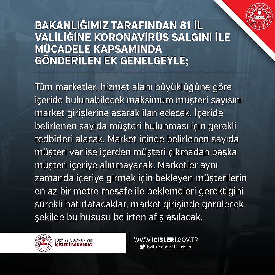 İl/ilçelerde tüm marketler 09:00-21:00 saatleri arasında hizmet verecek. Market içindeki en fazla müşteri sayısı müşteriye doğrudan hizmet sunulan toplam alanın (depolar, idari bürolar vb. hariç) onda biri kadar olacak. Örneğin marketin müşterilerin hizmetine sunulan alanı 100 metrekare ise aynı anda içeride en fazla 10 müşteri olması gerekecek. Tüm marketler, hizmet alanı büyüklüğüne göre içeride bulunabilecek maksimum müşteri sayısını market girişlerine asarak ilan edecek. İçeride belirlenen sayıda müşteri bulunması için gerekli tedbirleri alacak. Market içinde belirlenen sayıda müşteri var ise içerden müşteri çıkmadan başka müşteri içeriye alınmayacak. Marketler aynı zamanda içeriye girmek için bekleyen müşterilerin en az bir metre mesafe ile beklemeleri gerektiğini sürekli hatırlatacaklar, market girişinde görülecek şekilde bu hususu belirten afiş asılacak. İl/ilçelerdeki tüm şehir içi ve şehirlerarası çalışan toplu taşıma araçları (şehirlerarası yolcu otobüsleri dahil); araç ruhsatında belirtilen yolcu taşıma kapasitesinin %50’si oranında yolcu kabul edecek; araç içindeki yolcuların oturma şekli yolcuların birbirleriyle temasını engelleyecek şekilde olacak. Bakanlığımız söz konusu tedbirlere ilişkin Vali/Kaymakamlar tarafından Umumi Hıfzıssıhha Kanunu ve diğer mevzuat hükümleri çerçevesinde gerekli kararların alınarak, marketlere ilişkin kararların il/ilçe belediyeleri ile işbirliği yapılarak, toplu taşıma araçları ile ilgili olanların ise trafik zabıtasının etkin denetimi ve koordinesinde ivedilikle planlanması/uygulanması ve tüm kolluk birimlerimiz tarafından konunun takip edilerek uygulamada herhangi bir aksaklığa meydan verilmemesini istedi.