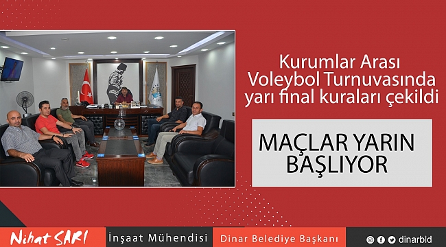 30 Ağustos Zafer Haftası Etkinlikleri kapsamında; belediyemiz tarafından bu yıl 2.si düzenlenen Dinar Belediyesi 2.Geleneksel Kurumlar Arası Voleybol Turnuvasında yarı final müsabakalarına hak kazanan 4 takımın temsilcisinin katılımıyla Dinar Belediye Başkanımız Nihat Sarı başkanlığında kuralar çekildi. 10 Takımın katıldığı ve lig usulü oynanan turnuvada 9. Hafta maçlarının tamamlanması ile birlikte en yüksek puanı alan 4 takım sırasıyla; 27 puan ile Dinar Belediyesi, 22 puan ile Dinar Milli Eğitim Müdürlüğü, 22 Puan ile Dinar Devlet Hastanesi ve 21 puan ile Dinar Ceza Evi oldu. Çekilen kura sonucunda; 18 Ağustos Perşembe günü saat 19:00’da Dinar Belediyesi ile Dinar Ceza Evi müsabakası oynanacak. Akabinde ise saat 20:00’de Dinar Devlet Hastanesi ile Dinar Milli Eğitim Müdürlüğü müsabakası gerçekleşecek. Maçların sonucunda mağlup olan takımlar 21 Ağustos Pazartesi günü saat 19:00’da 3.lük maçına çıkarken galip gelen takımlar ise şampiyonluk mücadelesi için saat 20:00’de final maçına çıkacak. Turnuvaya katılan tüm takımlara teşekkür eden Belediye Başkanımız Nihat Sarı, yarı finale kalan takımlarımıza maçlarında başarılar diledi.Dinar Gündem Gazetesi