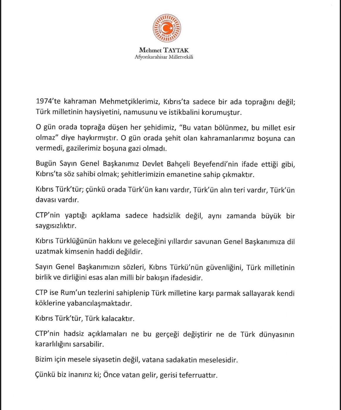 Milliyetçi Hareket Partisi (MHP) Afyonkarahisar Milletvekili Mehmet Taytak, CTP’nin MHP Genel Başkanı Devlet Bahçeli’yi hedef alan açıklamasına sert sözlerle tepki gösterdi.Taytak, X hesabından yaptığı açıklamada Kıbrıs’ın Türkiye için bir “vatan davası” olduğunu vurgulayarak şu ifadeleri kullandı:“1974’te kahraman Mehmetçiklerimiz Kıbrıs’ta sadece bir ada toprağını değil; Türk milletinin haysiyetini, namusunu ve istikbalini korumuştur.Kıbrıs Türk’tür; çünkü orada Türk’ün kanı, alın teri ve davası vardır.CTP’nin yaptığı açıklama sadece hadsizlik değil, aynı zamanda büyük bir saygısızlıktır.