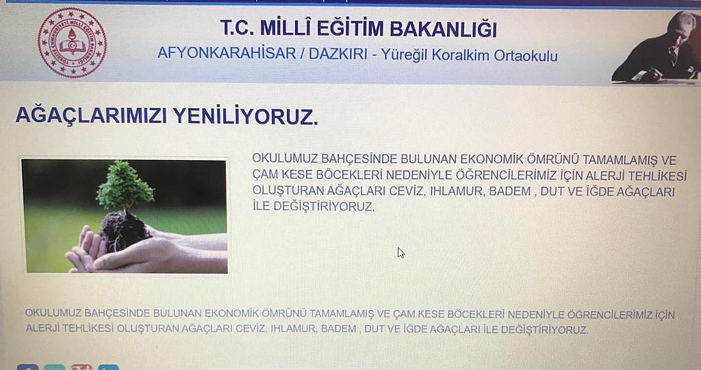 Afyonkarahisar Dazkırı ilçesine bağlı Yüreğil Köyü Koralkim Ortaokulu bahçesinde iddialara göre 50 yıllık çam ağaçlarının kesildiği bildirildi. Dazkırı Yüreğil köyü ve ilçe merkezinde ki doğa sever, duyarlı vatandaşlar gazetemize ulaşarak konuyu Gündem Gazetemize iletti. İddialara göre tepkiler büyüyünce Okul yetkilileri açıklama yaptı.Dazkırı Yüreğil Koralkim Ortaokulu Haber Sitesinden yaptığı açıklama:"OKULUMUZ BAHÇESİNDE BULUNAN EKONOMİK ÖMRÜNÜ TAMAMLAMIŞ VE ÇAM KESE BÖCEKLERİ NEDENİYLE ÖĞRENCİLERİMİZ İÇİN ALERJİ TEHLİKESİ OLUŞTURAN AĞAÇLARI CEVİZ, IHLAMUR, BADEM , DUT VE İĞDE AĞAÇLARI İLE DEĞİŞTİRİYORUZ.OKULUMUZ BAHÇESİNDE BULUNAN EKONOMİK ÖMRÜNÜ TAMAMLAMIŞ VE ÇAM KESE BÖCEKLERİ NEDENİYLE ÖĞRENCİLERİMİZ İÇİN ALERJİ TEHLİKESİ OLUŞTURAN AĞAÇLARI CEVİZ, IHLAMUR, BADEM , DUT VE İĞDE AĞAÇLARI İLE DEĞİŞTİRİYORUZ." yapıldıDinar Gündem Gazetesi