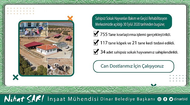 Dinar Belediye Başkanımız Nihat Sarı’nın seçim beyannamesinde yer alan ve 30 Eylül 2020 tarihinde hizmete açılan Sahipsiz Sokak Hayvanları Bakım ve Geçici Rehabilitasyon Merkezimizde 755 tane hayvana Kısırlaştırma işlemi yapılırken, 117 tane Köpek ve 21 tane kedi tedavi edildi. Bunun yanı sıra 34 tane sahipsiz sokak hayvanımız sahiplendirildi.