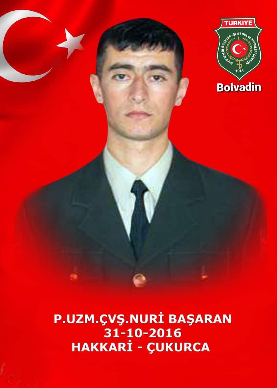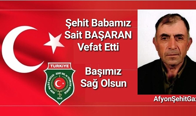 31.10.2016 Tarihinde Hakkari Çukurca'da Şehit Olan Bolvadin İlçemiz Nüfusuna Kayıtlı Şehidimiz Şehit P.Uzm.Çvş. Nuri Başaran'ın Babası Sait Başaran Bu Gün Tedavi Gördüğü Hastanede Vefat Etmiştir.Cenazesi Yarın (20.05.2023 Cumartesi) Öğle Namazına Müteakip Bolvadin Çarşı Camiinden Son Yolculuğuna Uğurlanacaktır..