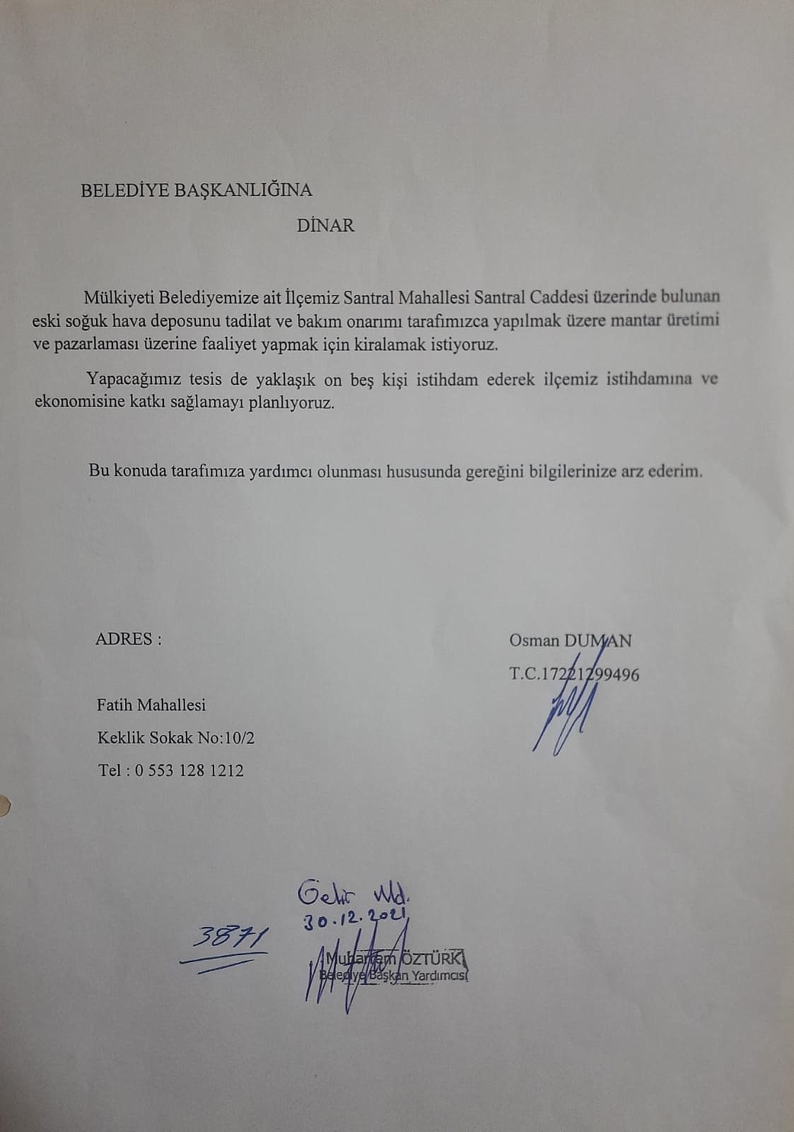 Belediye Başkanımız Nihat Sarı ve encümen üyeleri huzurunda yapılan ihaleye katılan Osman Duman Soğuk Hava Deposunu mantar üretiminde kullanacağını ve yaklaşık 15 kişi çalıştırmayı taahhüt ederek aylık 1,100 Türk Lirası bedel karşılığında kiralamıştır.