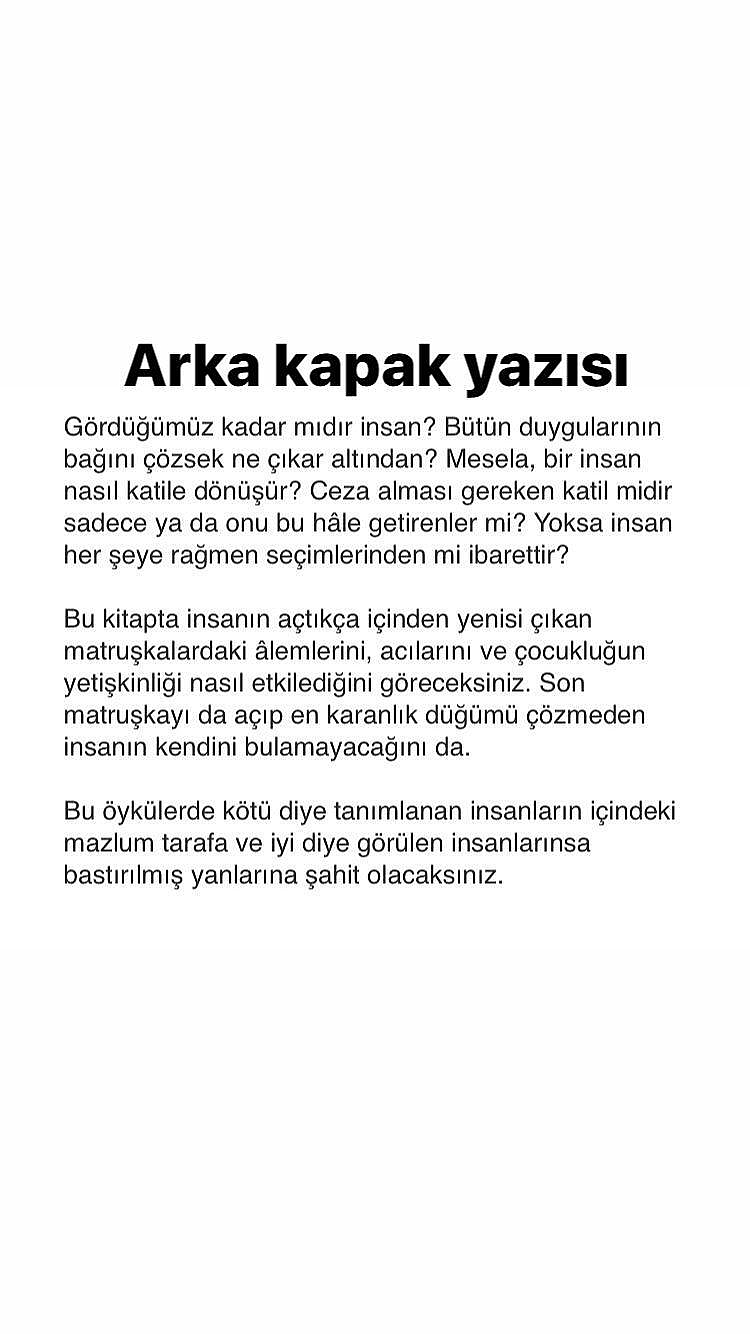 Eski Dinar Belediyesi Başkanı ve Aile ve Sosyal Politikalar Bakanlığı Sosyal Yardımlar Genel Müdür Yardımcısı Mustafa Tarlacı'nın kızı Beyza Mutlu'nun 'Son Matruşka' isimli kitabı okuyucu ile buluştu.Aile ve Sosyal Politikalar Bakanlığı Sosyal Yardımlar Genel Müdür Yardımcısı Mustafa Tarlacı ise konu ile alakalı şu ifadeleri kullandı; "Kızım Beyza Mutlu’nun kitabı çıktı dostlarım. Evde kaldığımız bu günlerde en güzel şey kitap okumaktır. Zevkle okuyacağınız bir kitap olacaktır inşallah. Selam ve saygılarımla." DediKitap “öykü” türünde. İçinde birbirinin hayatlarına bir yerlerden dokunmuş insanların yaşam öyküleri var. Dışardan pısırık görünen, gaddar görünen, yalnız kalan, kaybetmiş, kazanmış görünen yetişkinlerin içleri, hayatları, çocuklukları... Bu yüzden ismi SON MATRUŞKA. İnsanın iç içe geçmiş duygular, hisler, acılar, hasretler bütünü olduğundan yola çıkarak koyuldu bu isim. Dışardan göründüğü gibi değil çünkü kimse. Kapakta göründüğü gibi, gözyaşının içinde gizli bir çocuk var. O yüzden matruşkalarımızı tek tek açıp tanıyarak kendimizi tanıyabilir, Rabbin şifasına ulaşabiliriz. ... “Bir ben var benden içeri” derken yıllardır, gerçekten idrak ederek mi söyledik bunları? Sus pus oturan bir çocuğun içinde ne vardı? Peki ya alanında lider olan birinin? En önde olacağım diye koşup dururken parçalanmamış mıydı ruhu? Kaybetmemiş miydi hayatın kalanını? Peki çocukların yaralarına inmeye cesaret ettiniz mi hiç? Tecavüze uğrayan bir kızı, Babasından yıllarca dayak yemiş bir adamı, Babası şehit olmuş çocuğun acısını, Savaştan kaçan bir kızın kimsesizliğini, Banyoya kilitlenmiş bir evladın hissettiği çaresizliği, Duymaya cesaretiniz var mı? Eğer varsa, SON MATRUŞKA’da onları dinleyebilirsiniz... Son Matruşka, satış noktalarında. Kitapyurdu, d&r, bkmkitap, idefix gibi internet kitap satış sitelerinden temin edebilirsiniz.
