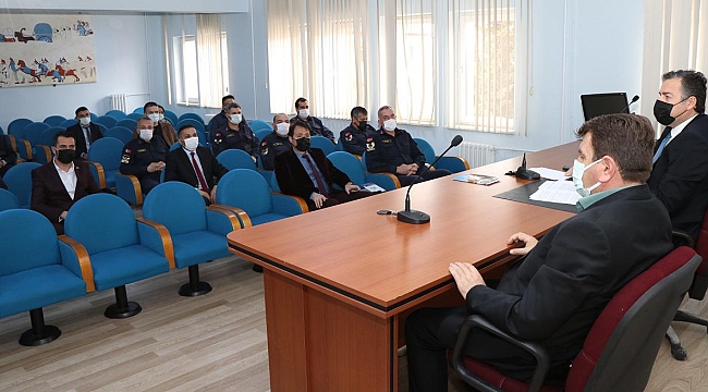 İlçemiz Hükümet Konağı Toplantı Salonunda 29Nisan-17Mayıs tarihleri arasında İçişleri Bakanlığı Genelgesi Doğrultusunda yapılacak Tam Kapanmayla ilgili Kaymakamımız Selami Kapankaya