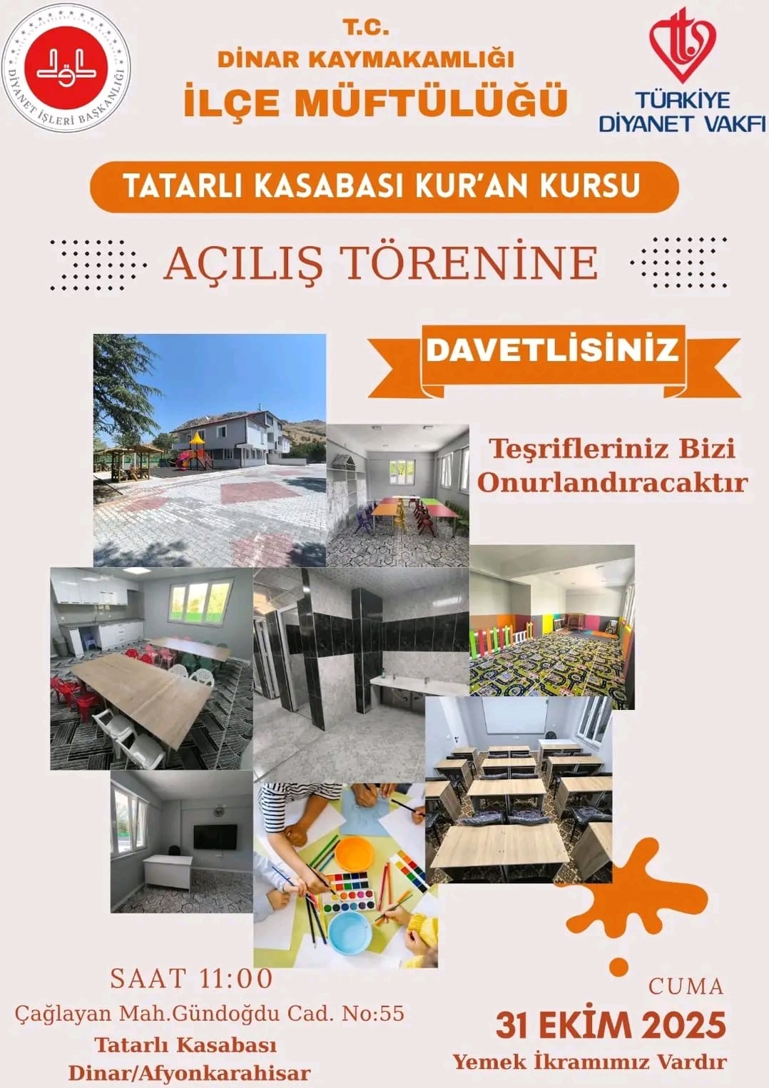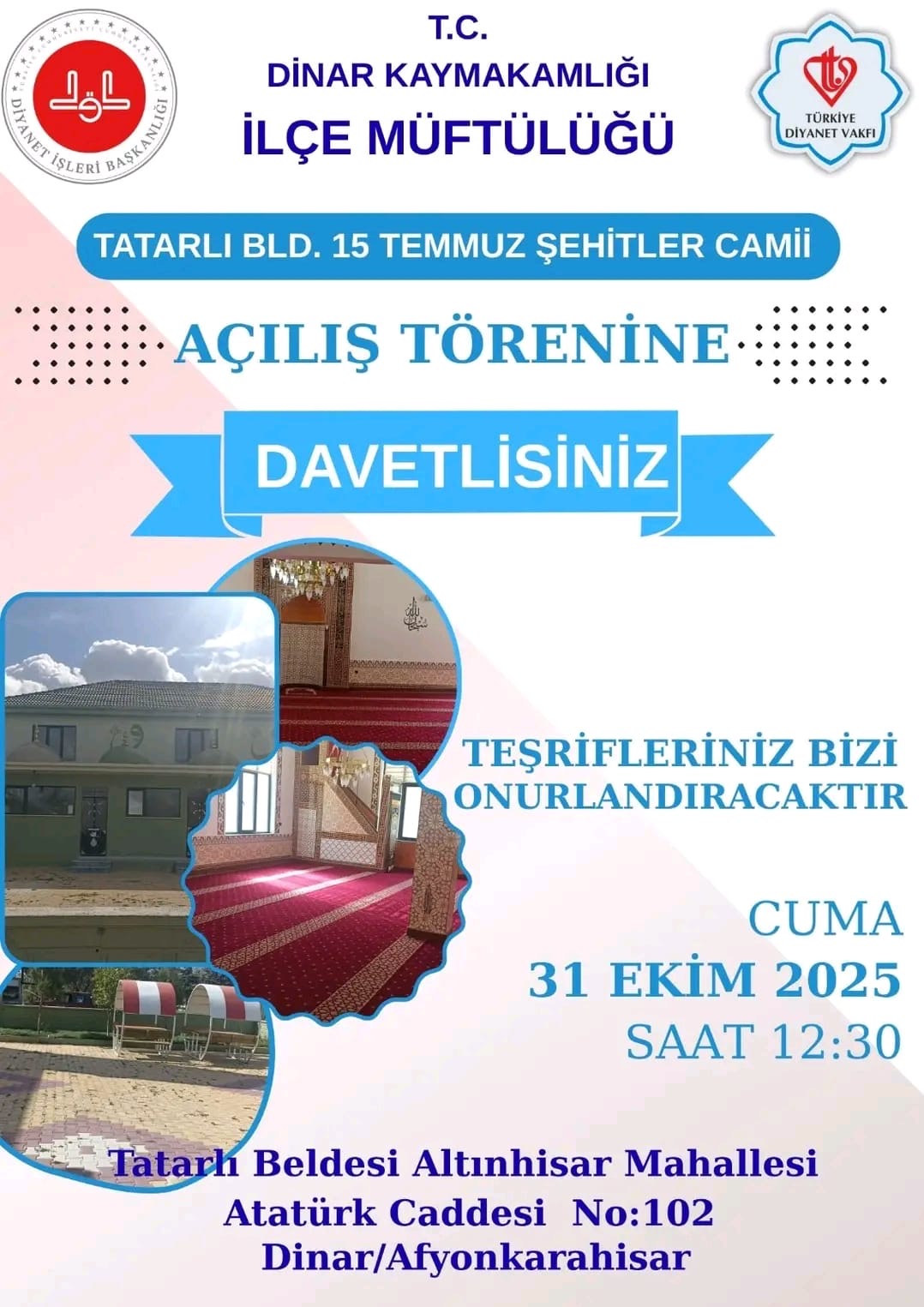 Dinar İlçe Müftülüğü tarafından 31 Ekim 2025 Cuma günü Tatarlı’da iki önemli açılış töreni gerçekleştirilecek. Günün ilk programı, Tatarlı Kasabası Kur’an Kursu’nun açılışı olacak. Çağlayan Mahallesi Gündoğdu Caddesi No:55 adresinde düzenlenecek tören saat 11.00’de başlayacak. Açılışın ardından katılımcılara yemek ikramı yapılacak. Aynı gün ikinci program, Tatarlı 15 Temmuz Şehitler Camii’nin açılış töreni ile devam edecek. Altınhisar Mahallesi Atatürk Caddesi No:102 adresindeki cami açılışı saat 12.30’da gerçekleştirilecek. Dinar Müftülüğü tarafından yapılan açıklamada, “Her iki açılış törenine tüm halkımız davetlidir. Teşrifleriniz bizi onurlandıracaktır.” ifadelerine yer verildi. Tarih: 31 Ekim 2025 Cuma