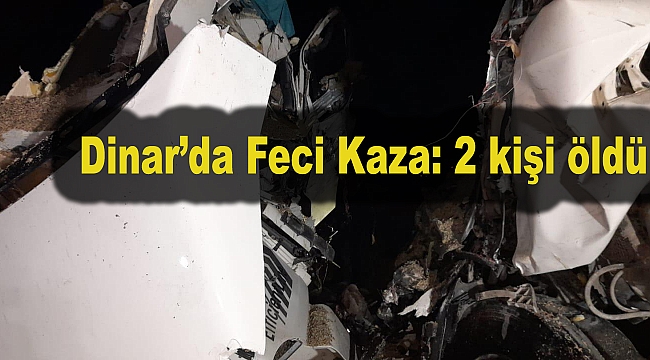 Dinar ilçesi Tatarlı Kasabasında yaşanan kazada 2 kişi yaşamını yitirdiAfyonkarahisar'da bir hazır beton mikseri kamyonu ile TIR'ın çarpışması sonucu meydana gelen trafik kazasında 2 kişi hayatını kaybetti.Kaza, 01: 00 sıralarında Afyonkarahisar Dinar - Çay Konya karayolu Dinar ilçesi Tatarlı Kasabası girişinde meydana geldi.Edinilen bilgilere göre; Küspe yüklü TIR ile hazır beton mikseri çarpıştı.Kafa kafaya çarpışan Tır ile hazır beton mikseri birbirine yapıştı.Olay yerine çok sayıda ambulans ve itfaiye ekipleri sevk edildi. Kazada 42 AHD 469 plakalı Tır’ın sürücüsü Hakan P. ve Hazır Beton Mikseri 07 GEL 56 Kamyonunun Sürücüsü Hüseyin Y. yaşamını yitirdi.Afyonkarahisar Dinar-Çay Konya karayolu bir müddet trafiğe kapandı. Trafiğe kapanan Çay Konya karayolu kazaya karışan araçların yoldan çekici yardımı ile kaldırılmasının ardından tekrar trafiğe açıldı.Hakan P. ve Hüseyin Y.’ün cansız bedenleri araçlardan çıkartılarak Haydarlı Devlet Hastanesi morguna konuldu.Kaynak Dinar Gündem GazetesiDHA Tahsin Baytar