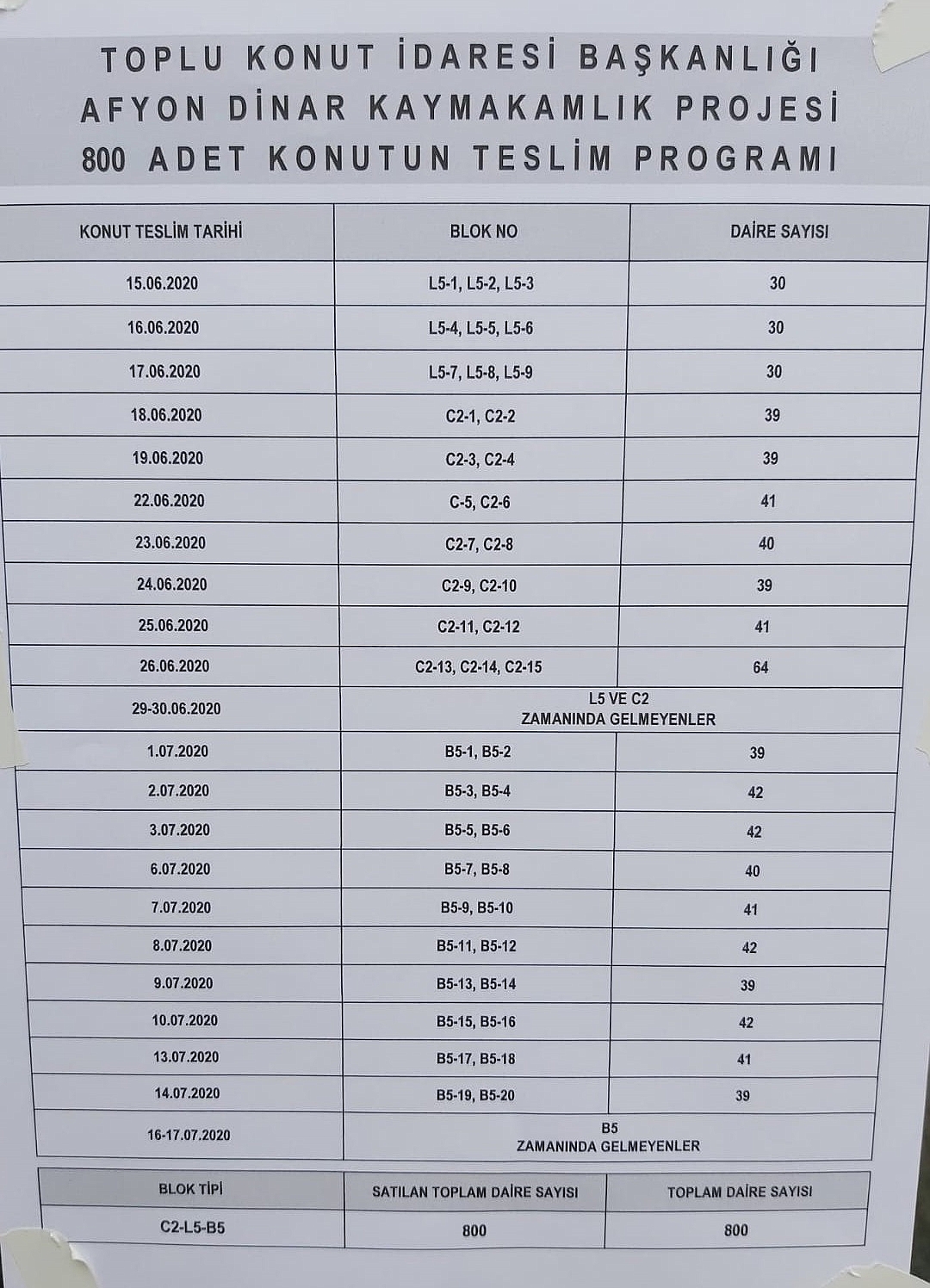 TOKİ 800 konutların teslim tarihlerinin olduğu program ekte bulunan belgede yer almaktadır. Hak Sahipleri 800 Konutların içerisinde bulunan yüklenici firmanın