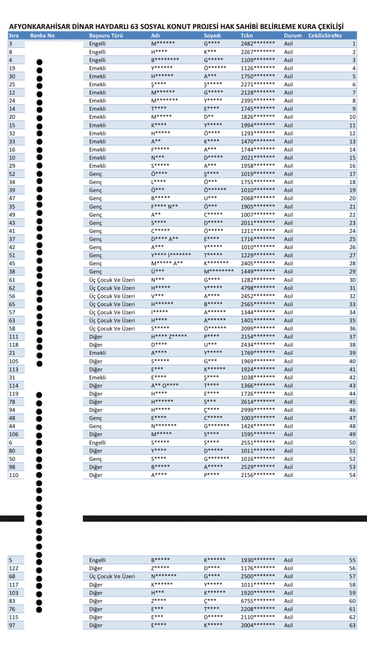 TOKİ’nin Afyonkarahisar Dinar’a bağlı Haydarlı beldesinde yürüttüğü 63 Sosyal Konut Projesi için hak sahipliği kura sonuçları açıklandı. Engelli, emekli, genç, üç ve üzeri çocuklu aileler ile diğer başvuru kategorilerinden başvuran vatandaşların yer aldığı hak sahipleri listesi yayımlandı. İsimler başvuru numarası ve kura sıra numarasına göre ilan edildi. Konut almaya hak kazanan vatandaşların, TOKİ’nin duyuracağı takvim doğrultusunda sözleşme işlemlerini gerçekleştirmesi gerekiyor. Kura sonuç listesi ilgili kurumlar ve resmi kanallar üzerinden erişime açıldı.Dinar Gündem Gazetesi