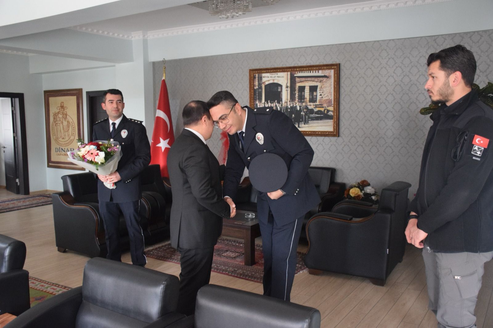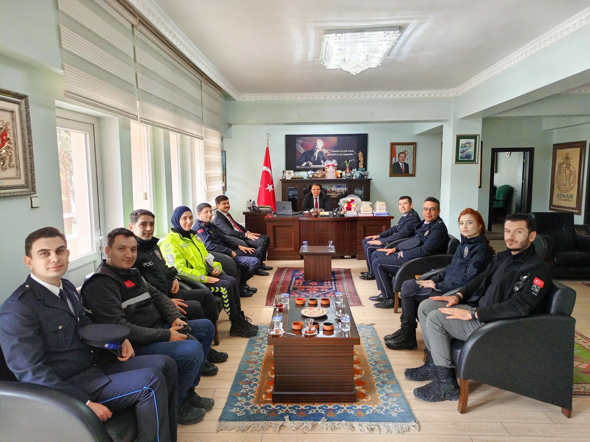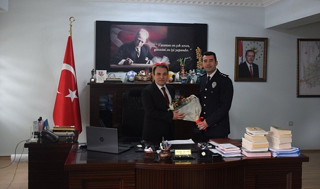 İlçe Emniyet Müdürü Tolga Pazar, 10 Nisan Polis Günü ve Polis Haftası dolayısıyla İlçe Emniyet Müdürlüğü personeli Emniyet Mensupları ile birlikte Kaymakamımız Kemal Duru’yu ziyaret etti.