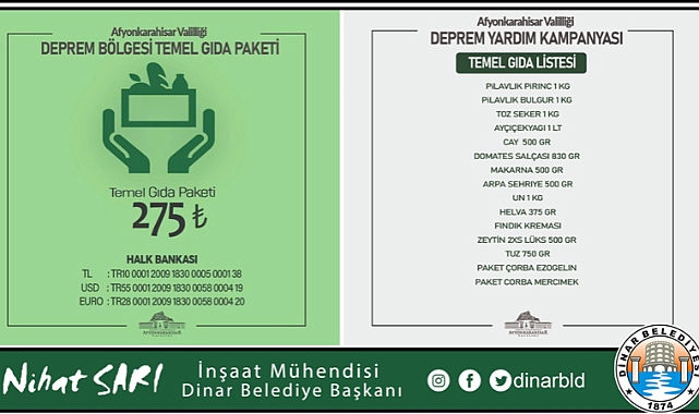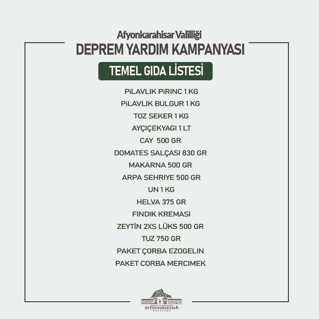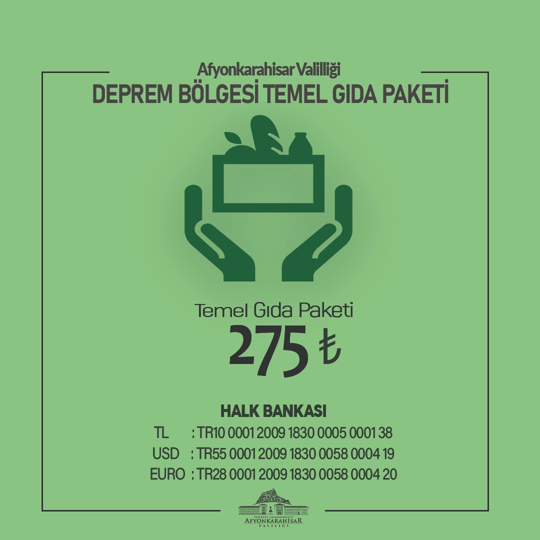 10 ilimizi etkileyen üzücü depremin ardından bundan sonraki süreçte depremzedelerimiz için gıda yardımı ihtiyaç duyulacağından Afyonkarahisar Valiliğimiz önderliğinde başlatılan kampanya kapsamında aşağıda paylaştığımız şekilde 275 Türk Lirası değerinde “Temel Gıda Paketi” yardımı yapabilirsiniz.