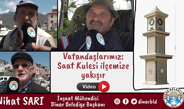 Dinar Belediye Başkanımız Nihat Sarı’nın Saat Kulesi çalışması ile ilgili halkımızın görüşünü aldık. Halkımız ilçemizde bir değişimin olduğunu ve değişimin gözle göründüğünü belirterek, saat kulesi projesinin de ilçemize yakışacağına inandıklarını ifade ederek, ilçemize güzel hizmetler kazandıran Belediye Başkanımız Nihat Sarı’ya teşekkür ettiler.