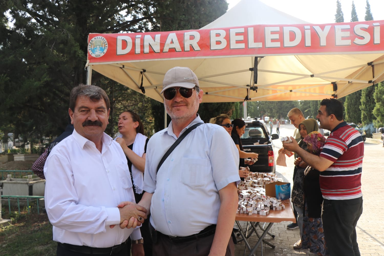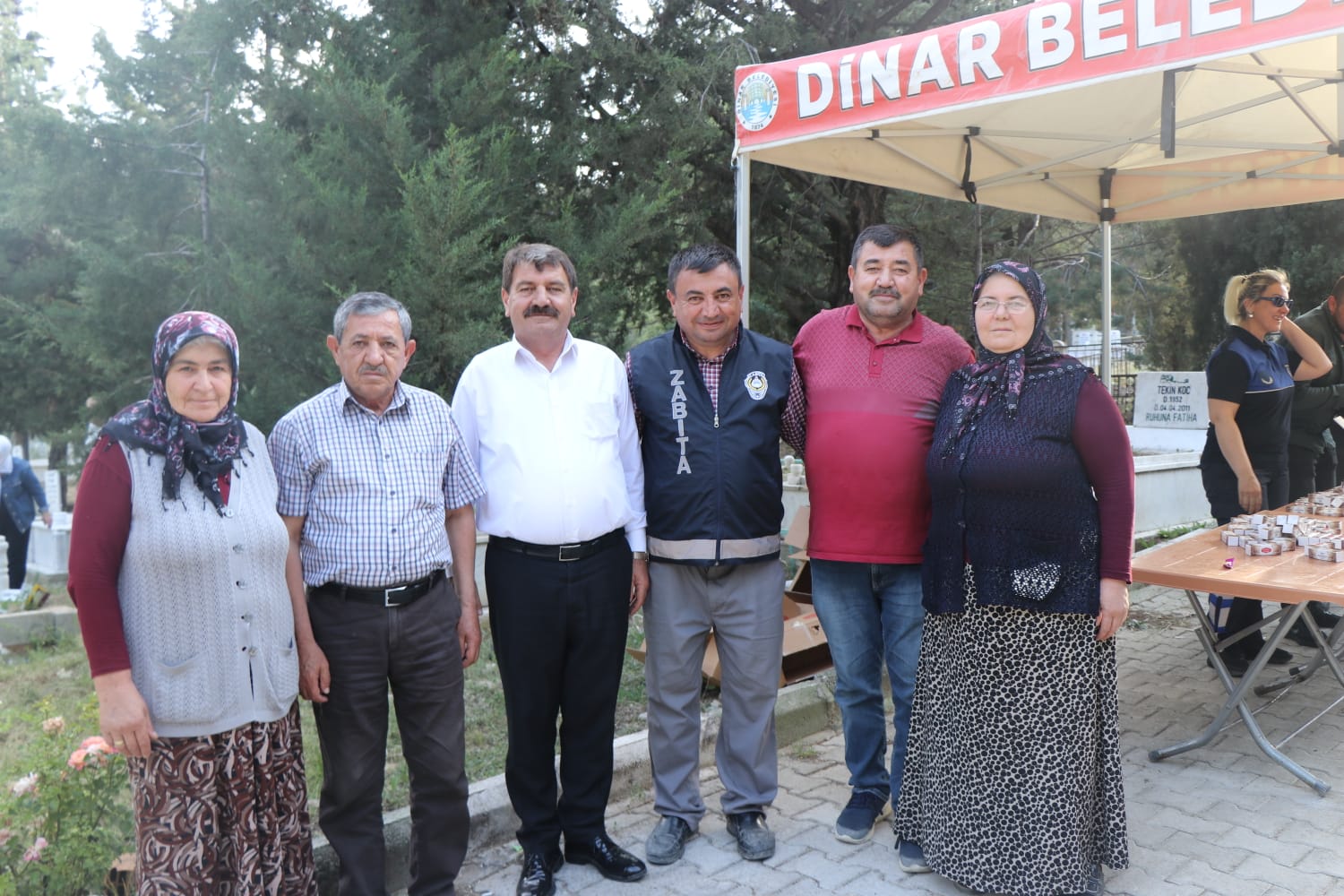 Vatandaşlarımızın Kurban Bayramı’nı kutladıkDinar Belediye Başkanımız Nihat Sarı, Kurban Bayramı arefesinde ilçemiz Asri Mezarlığına kabir ziyaretine gelen vatandaşlarımız ile bayramlaştı.Dinar Belediye Başkanımız Nihat Sarı Ilk olarak aile yakınlarının ve Emekli İmam hatip Merhum Tahsin Hoca'nın kabirlerini ziyaret ederek kabri başında dua etti.Yoğun bir kalabalığın olduğu arefe gününde asri mezarlığa vefat eden yakınlarını ziyarete gelen vatandaşlarımız ile yaķından ilgilenip sohbet ederek mübarek Kurban bayramlarını kutlayıp şeker tadında bir bayram geçirmeleri temennisinde bulunan Belediye Başkanımız Nihat Sarı, vatandaşlarımıza her bayram geleneksel olarak dağıttığımız lokumlardan ikram etti.Vatandaşlarımız ise lokum ikramı dolayısıyla Dinar Belediye Başkanımız Nihat Sarı’ya teşekkür ettiler.Asri mezarlık çevresi ve iç bölümünde trafiği koordine eden zabıta ekiplerimiz ise çıkış bölümünde bekleyerek vatandaşlarımıza lokum ikram edip, hayırlı bayramlar temennisinde bulundular.Ayrıca ikindi namazı sonrasında Ulu Cami önünden kabir ziyaretine gitmek isteyen vatandaşlarımız için belediyemiz tarafından ücretsiz servis kaldırıldı.